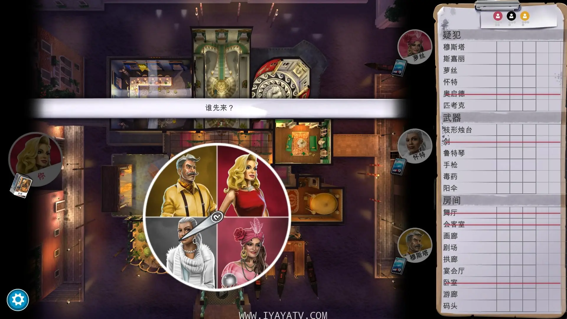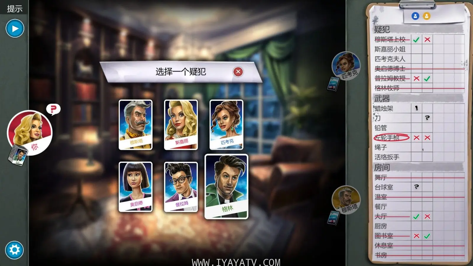 例如:“我怀疑是匹考克夫人,现场在书房,因器是绳子!”如果下一个玩家有其中的任何卡片,他们必须对你秘密出示一张,如果他们无法帮忙,问题就会顺时针到下一个玩家,面到有人能够向你出示一张卡片